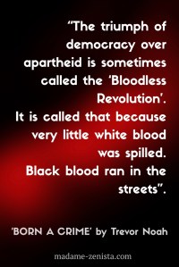 The triumph of democracy over apartheid is sometimes called the Bloodless Revolution. It is called that because very little white blood was spilled. Black blood ran in the streets.