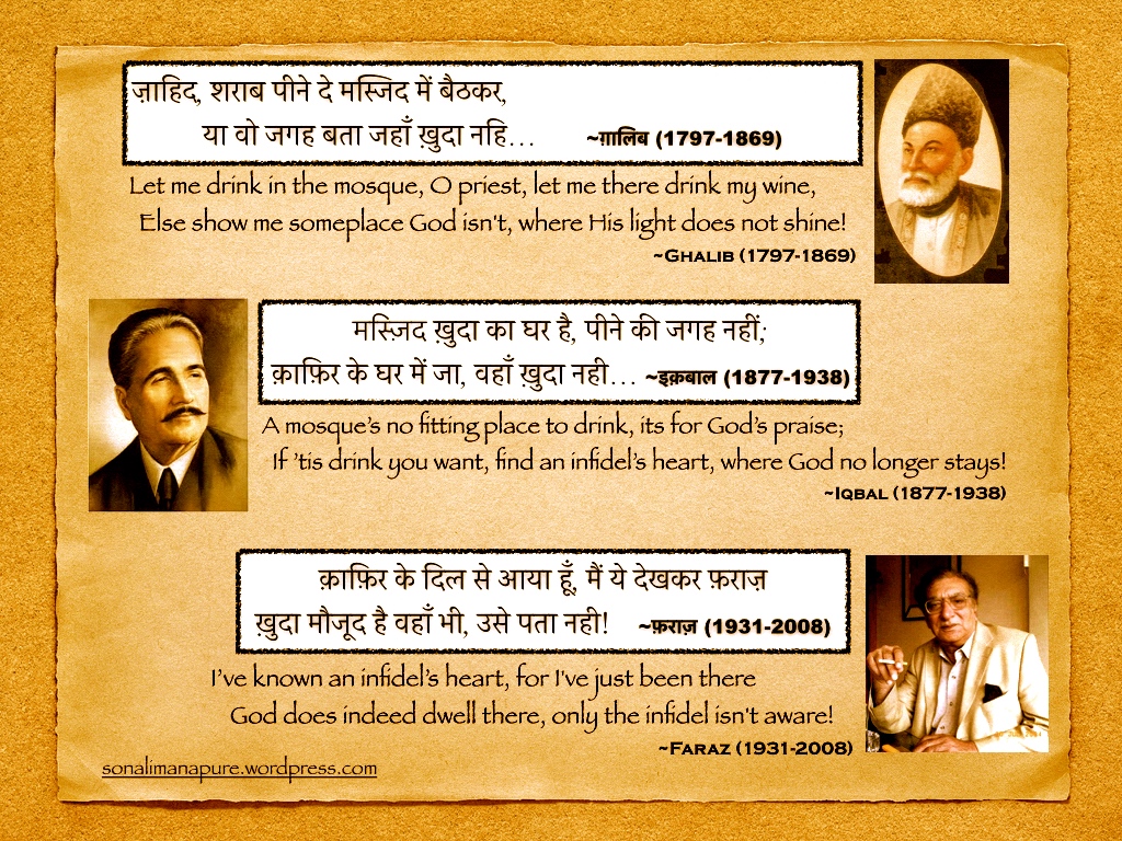 Those who know Urdu/Hindi, even if not very well conversant with Urdu/Hindi/Persian poetry, can appreciate the beauty of Shayari (meaning poetry in Urdu). These two-liners from the three great Urdu/Persian poets (who are from different time periods in history), when juxtaposed, create a beautiful flow and is truly a treat for the mind! They all talk of God’s presence, where one seems to aptly respond to the other.